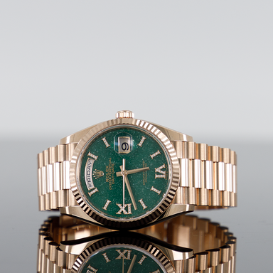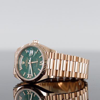 Rolex Day-Date 36mm Rose Gold Green Aventurine Roman Diamond Dial Fluted Bezel 128235